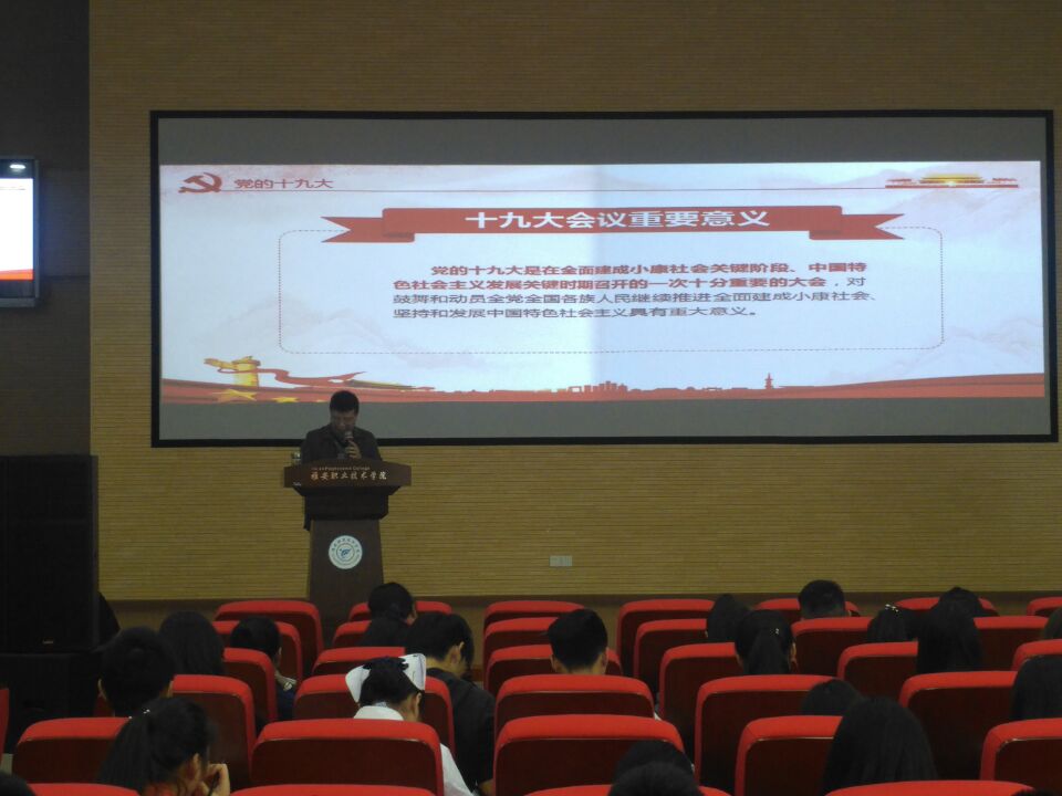 11月7日,思政部委派何衡老师给第四期团校培训班的学员进行党的十九大精神宣讲。为宣讲好十九大精神,何衡老师做了准备充分,反复研读十九大报告等,精心制作了PPT。他从十九大报告主题“不忘初心,牢记使命”入题,现场播放了习近平总书记在上海中共一大会址重温入党誓词视频,分析指出我们党在此诞生,从此出征,由此取得一个又一个的胜利,这是我们党的根脉,这是一次我们共产党人的初心永远不能改变的深情宣告,也是开启了向着伟大梦想进军的新征程的铿锵誓言。 何衡老师遵从报告知识逻辑、理论实践,对大会报告内容逐句逐段进行了深入浅出分析,侧重地强调了十九大报告中的职业教育和工匠精神等与同学们密切关注的问题,宣讲特别注重引导同学们要树立与党和国家一致的核心意识和看齐意识,以通俗的易懂大众化语言获得了良好的宣讲效果,讲座会上同学们聚精会神,边听边做笔记。