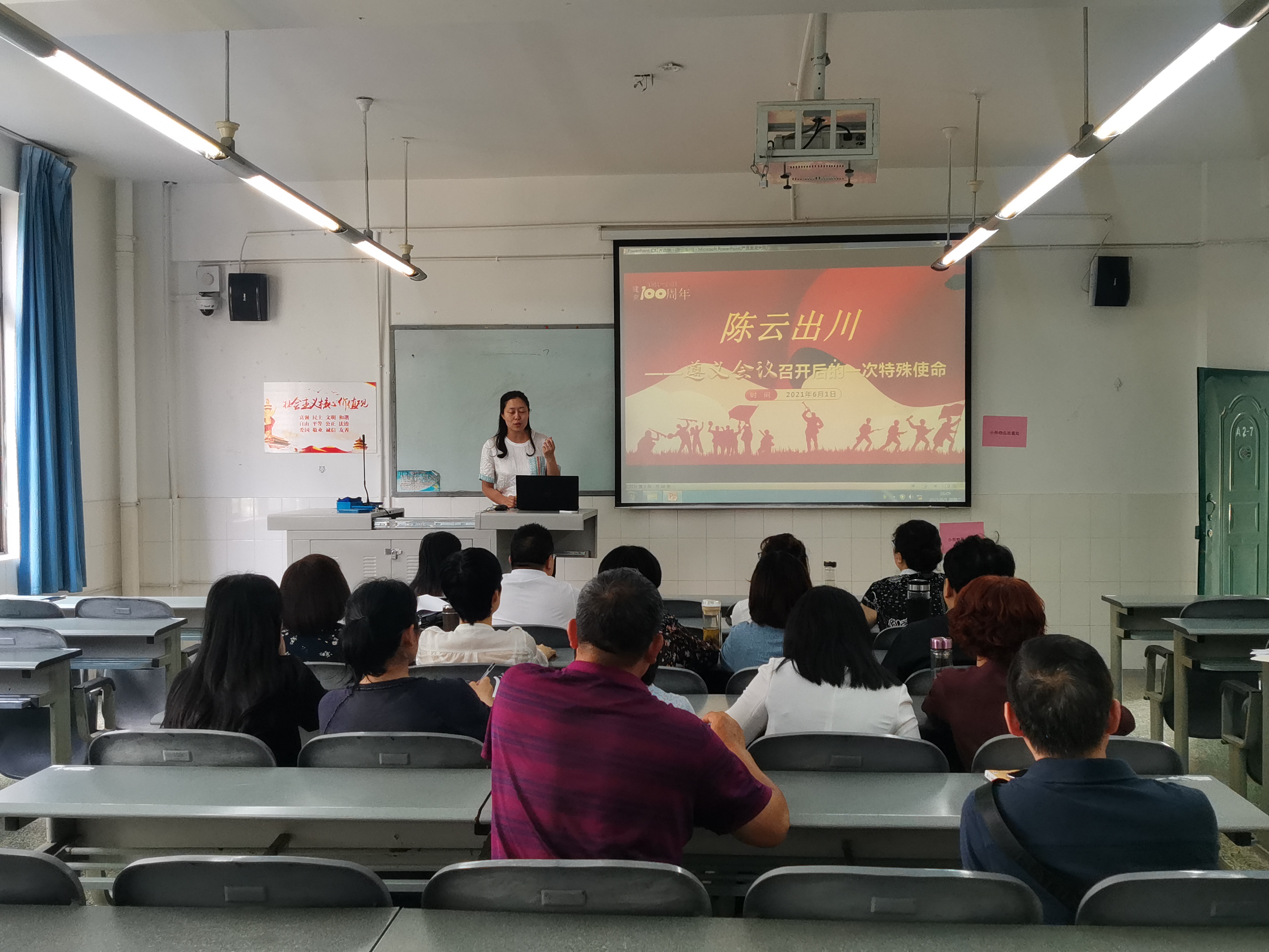 按照支部党史学习教育计划安排,本次学习由承担第三专题的任虹静老师为全体党员讲授了主题为“陈云出川——遵义会议召开后的一次特殊使命”的微党史课。在详实的历史事件讲授中,我们深入了解了中央为什么决定派陈云出川、出川经历的艰险历程,出川的重要意义。为了讲好本专题,任虹静老师进行了关于陈云的大量书籍,先后几次前往位于宝兴灵关的陈云展馆进行资料、图片的收集,对影像视频、文字等材料进行了整理和考证,力求能客观准确地还原历史的细节、人物的呈现,反映了思政教师严谨的治学态度,对党史人物的敬仰之心。