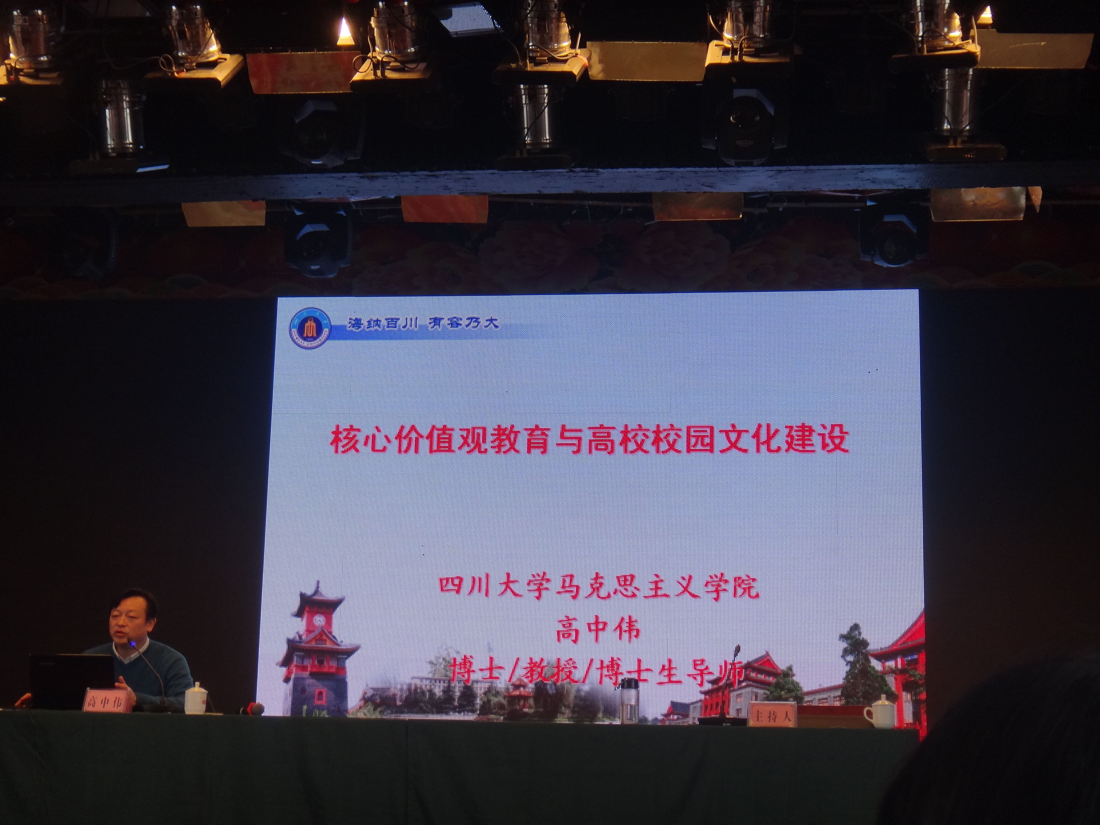 四川大学党委宣传部部长高中伟教授作了《核心价值观教育与高校校园文化建设》的专题报告。高中伟教授主要从弘扬和践行社会主义核心价值观的重要意义、如何正确理解社会主义核心价值观的基本内涵、四川大学开展核心价值观教育的三大品牌、培育信仰和践行;社会主义核心价值观的表率等四个方面进行了阐释。他提出,我们要加强理想信念教育,做仰望星空的表率;加强理论学习,做有理论素养的表率;加强人生观学习,做廉洁修身的表率。