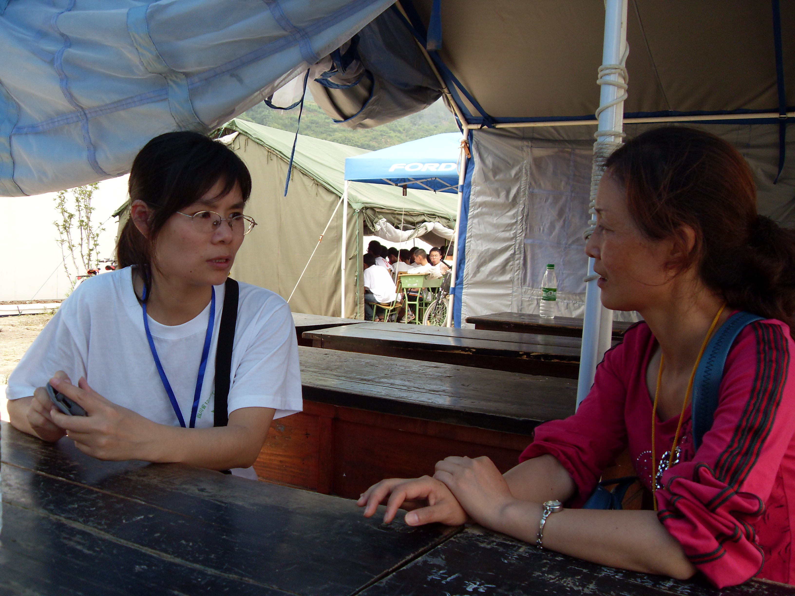 与四川绵阳平武灾区安置点的居委会工作人员进行交流