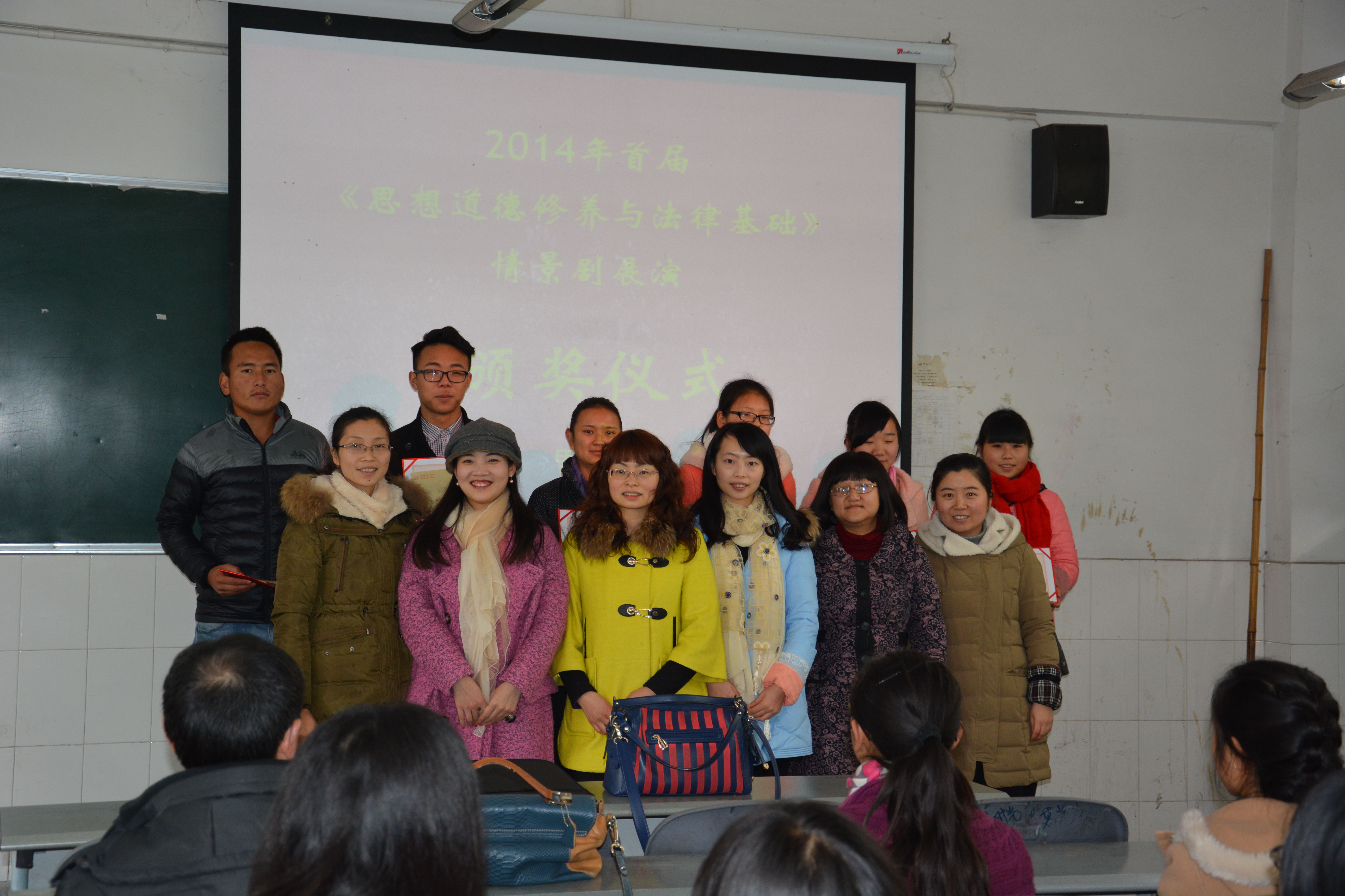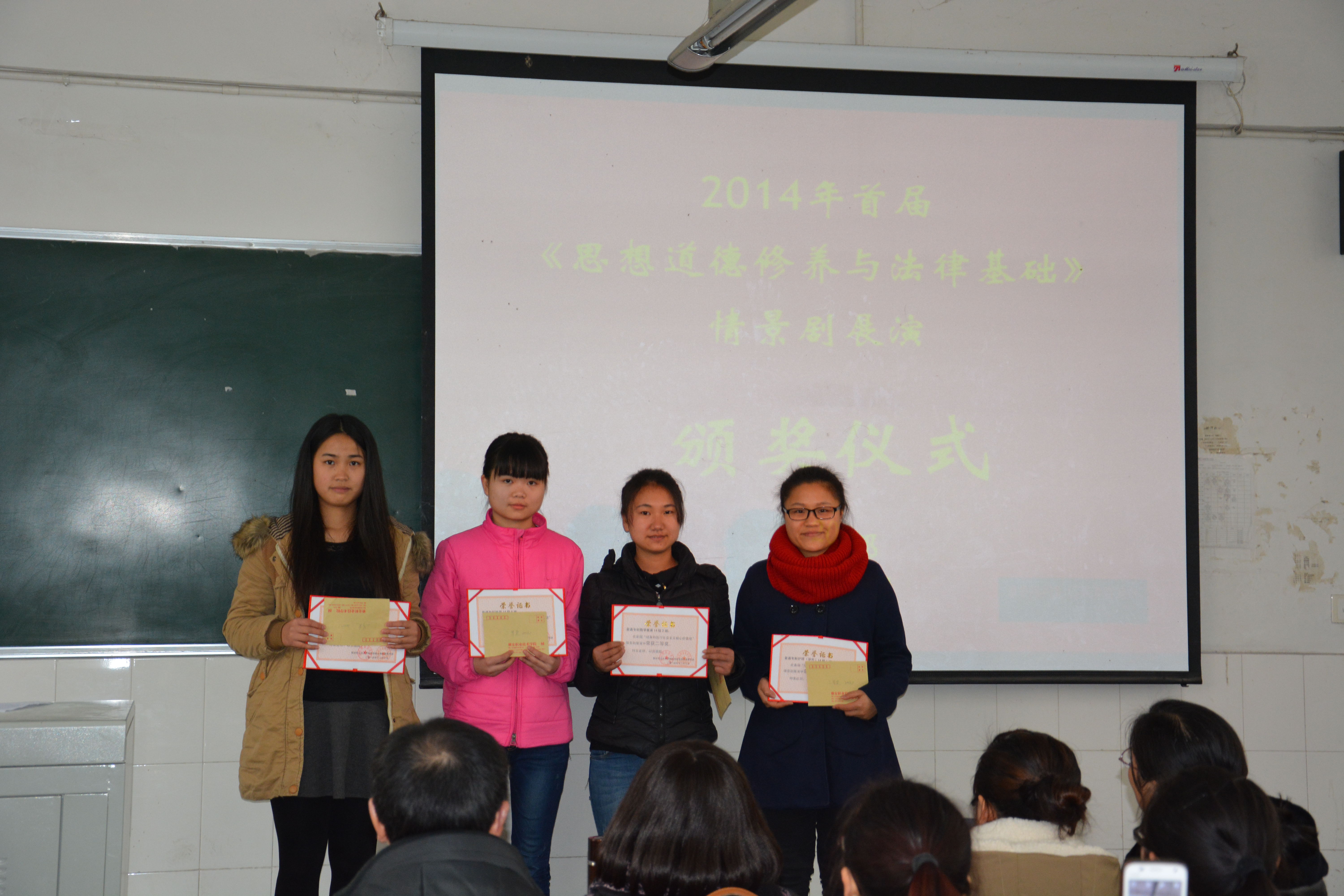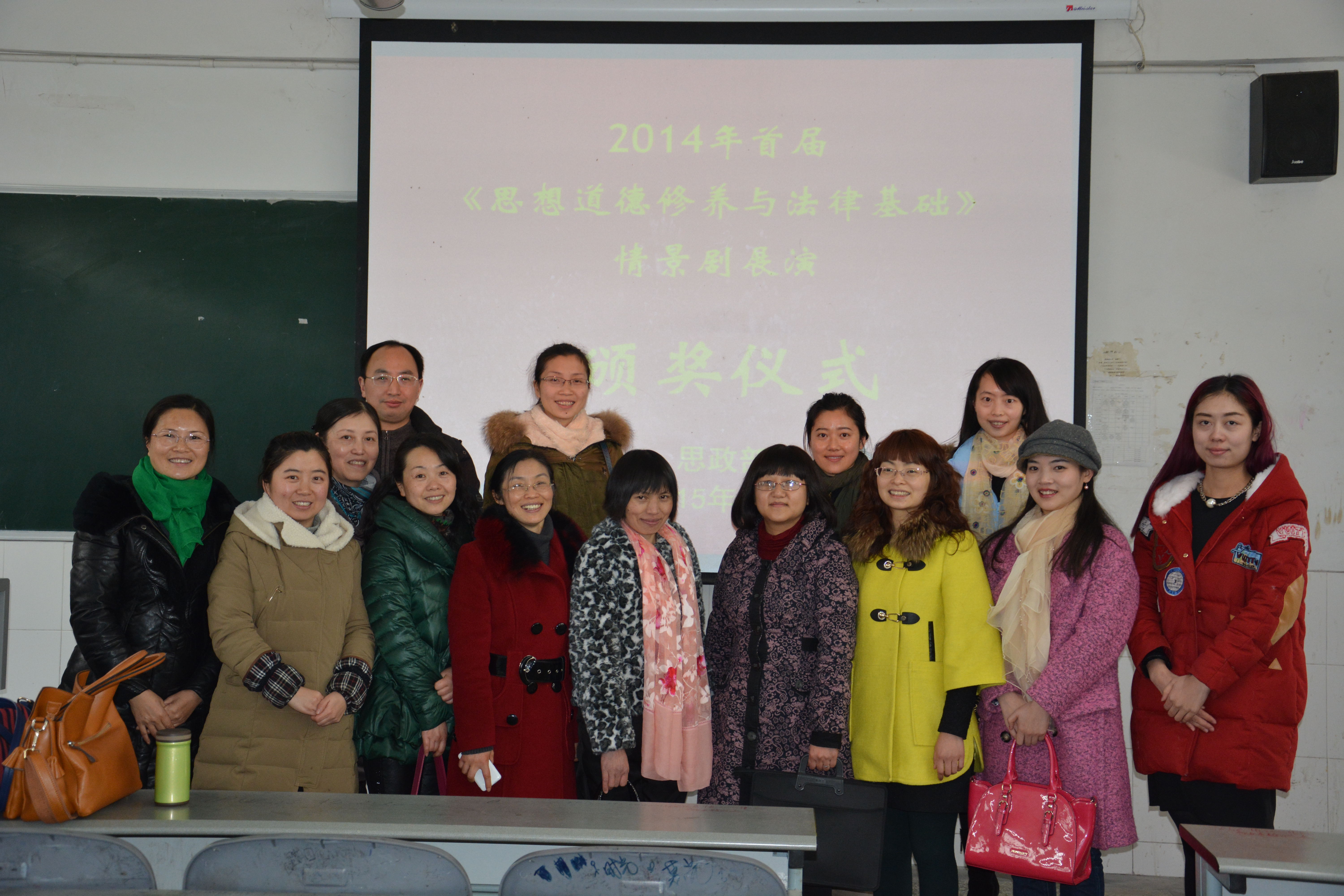 2015年1月6日,思政部在青年路校区B204教室举行了首届《思想道德修养和法律基础》情景剧展演颁奖仪式。思政部主任李霓、副主任洪松林、任课教师和参加展演的33个团队及员工代表共200余参加。颁奖仪式由德育教研室主任雷厉主持,思政部副主任洪松林宣布获奖名单,最后李霓主任发表总结讲话。此次情景剧展演选题丰富,内容积极向上,充分表现了同学们深入学习和践行社会主义核心价值观的风采。首届情景剧展演取得圆满成功,颁奖仪式在同学们热烈的掌声中落下了帷幕。